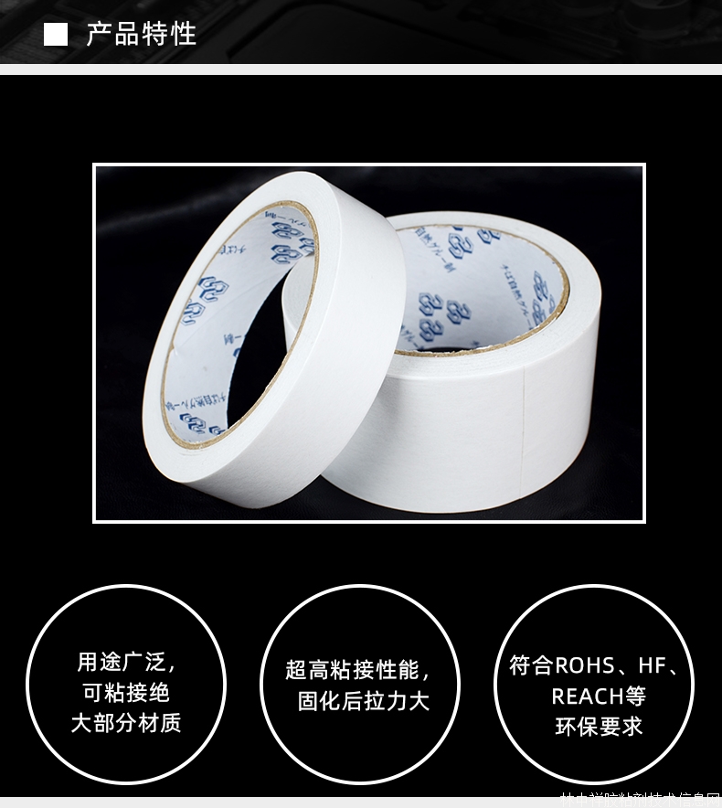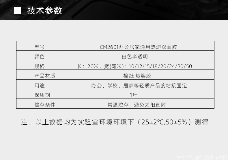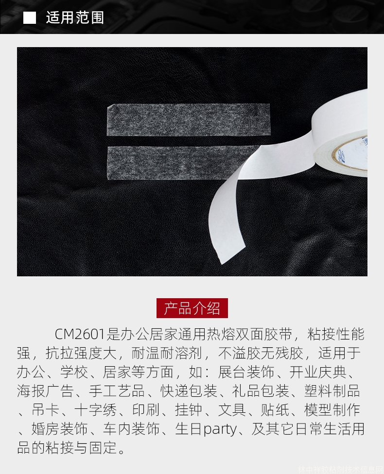 CM2601是辦公居家通用熱熔雙面膠帶,粘接性能強,抗拉強度大,耐溫耐溶劑,不溢膠無殘膠,適用于辦公、學校、居家等方面,如:展臺裝飾、開業慶典、海報廣告、手工藝品、快遞包裝、禮品包裝、塑料制品、吊卡、十字繡、印刷、掛鐘、文具、貼紙、模型制作、婚房裝飾、車內裝飾、生日party、及其它日常生活用品的粘接與固定。