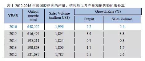 從2012年到2016年韓國膠粘劑的產(chǎn)量不斷增長,其中2016年增速較為明顯。表1列出了2012-2016年韓國膠粘劑的產(chǎn)量、銷售額以及產(chǎn)量和銷售額的增長率。我們可以看到2012年韓國膠粘劑的產(chǎn)量僅為581037噸,銷售額為17.87億美元,2012年相比上一年,產(chǎn)量及銷售額分別增長2.5%和2.6%,而2014年的增長率更低,僅有0.7%和0.8%。到2016年韓國膠粘劑產(chǎn)量達(dá)到了648552噸,銷售額達(dá)到了19.96億美元,產(chǎn)量和銷售額增長較快,分別達(dá)到了5.2%和5.4%。