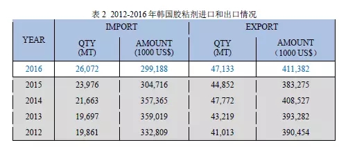 2012-2016年韓國膠粘劑進(jìn)出口情況