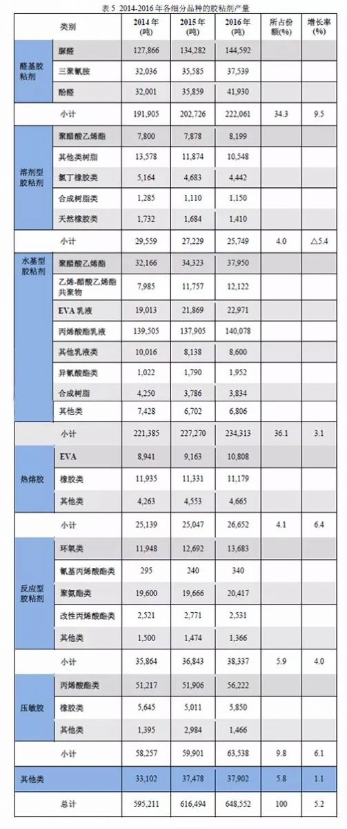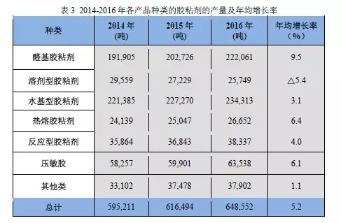從表5我們可以看到,2014-2016年各細(xì)分品種的膠粘劑產(chǎn)量。其中,醛基膠粘劑中量最大的是脲醛膠粘劑,但是從增長來看,增長率較大的為酚醛膠粘劑。溶劑膠粘劑中除了聚醋酸乙烯酯類膠粘劑還有所增長以外,其他幾類的膠粘劑都是逐年下降的。水基型膠粘劑中聚醋酸乙烯聚合物類膠粘劑的增長率較大,其他幾類也是逐年增長,只有合成橡膠這一類是逐漸下降的。熱熔膠類產(chǎn)品都是逐漸增長的,整體增長率達(dá)到了6.4%。反應(yīng)型和壓敏膠類品種也都是逐漸增長的,他們的年均增長率分別為4.0%和6.1%。