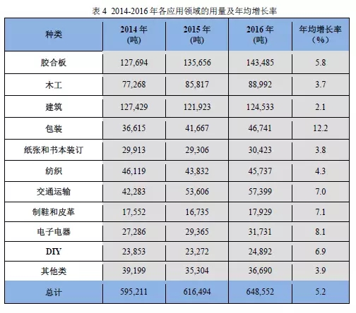 如果以膠粘劑應(yīng)用領(lǐng)域進(jìn)行劃分的話,可以分為:膠合板,占比22%;木工,占比13.6%;建筑,占比19.2%;包裝,占比7.2%;紙張和書本裝訂,占比4.8%;紡織,占比7.1%;交通運(yùn)輸,占比8.8%;制鞋和皮革,占比2.8%;電子電器,占比4.9%,DIY,占比3.8%;其他類,占比5.7%,共11個(gè)細(xì)分應(yīng)用領(lǐng)域。同時(shí)我們對膠粘劑各個(gè)應(yīng)用領(lǐng)域從2014-2016年的用量進(jìn)行了統(tǒng)計(jì),其中包裝領(lǐng)域的年均增長率最高,為12.2%;其次是電子電器領(lǐng)域,年均增長率達(dá)到8.1%;交通運(yùn)輸、制鞋和皮革、膠合板、DIY的年均增長率分別為7.0%、7.1%、5.8%和6.9%;紙張和書本裝訂、紡織及其他類的年均增長率分別為3.8%、4.3%、3.9%;木工和建筑年均增長率略低,分別為3.7%和2.1%。