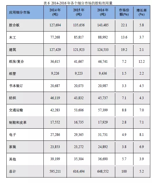 以膠粘劑應(yīng)用領(lǐng)域細(xì)分市場來統(tǒng)計(jì)的話,表6給出了2014-2016年各個(gè)細(xì)分市場的膠粘劑用量。其中整個(gè)市場份額最大的是膠合板,占比為22.1%,2014-2016年均增長率為5.8%。第二大的細(xì)分市場為建筑,占比19.2%,年均增長率為2.1%。排在第三位的是木工市場,占比13.6%,年均增長率3.7%。交通運(yùn)輸、紙張/復(fù)合、紡織分別占比為8.8%、7.2%和7.1%。書本裝訂和紙管的細(xì)分市場別占比為3.3%和1.5%。制鞋和皮革用占比為2.8%,年均增長率為7.1%。電子、家裝和其他類的細(xì)分市場分別占比為4.9%、3.8%和5.7%。所有細(xì)分市場里增長較快的有紙張和復(fù)合市場,增長率達(dá)到12.2%,電子類市場增長也較快,增長率達(dá)到8.1%。增長較慢的有建筑市場和紙管加工,增長率分別為2.1%和2.2%。