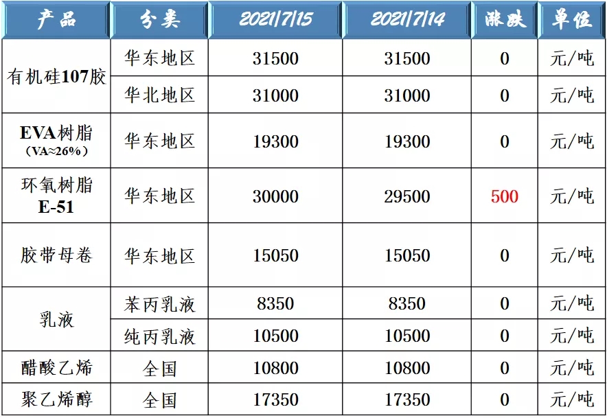 有機(jī)硅107、EVA樹脂、環(huán)氧樹脂、膠帶母卷、醋酸乙烯、聚乙烯醇和乳液原料價(jià)格走勢(shì)
