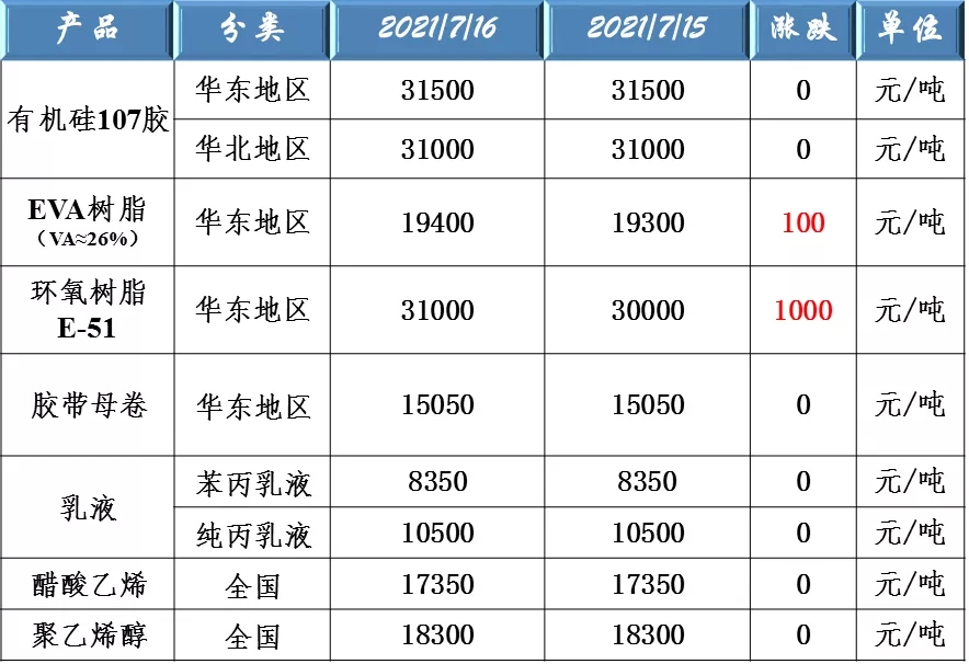 有機(jī)硅107、EVA樹脂、環(huán)氧樹脂、膠帶母卷、醋酸乙烯、聚乙烯醇和乳液原料價(jià)格走勢(shì)