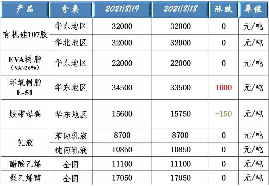 有機(jī)硅107、EVA樹(shù)脂、環(huán)氧樹(shù)脂、膠帶母卷、醋酸乙烯、聚乙烯醇和乳液原料價(jià)格走勢(shì)