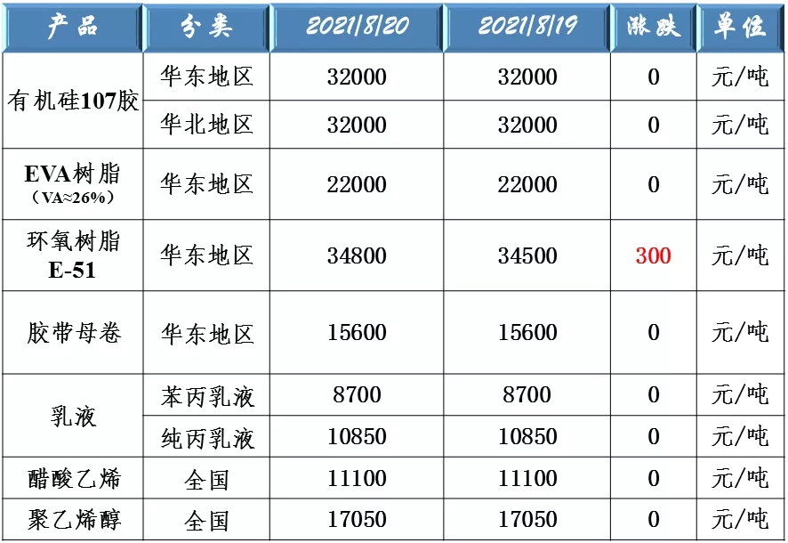 有機硅107、EVA樹脂、環氧樹脂、膠帶母卷、醋酸乙烯、聚乙烯醇和乳液原料價格走勢