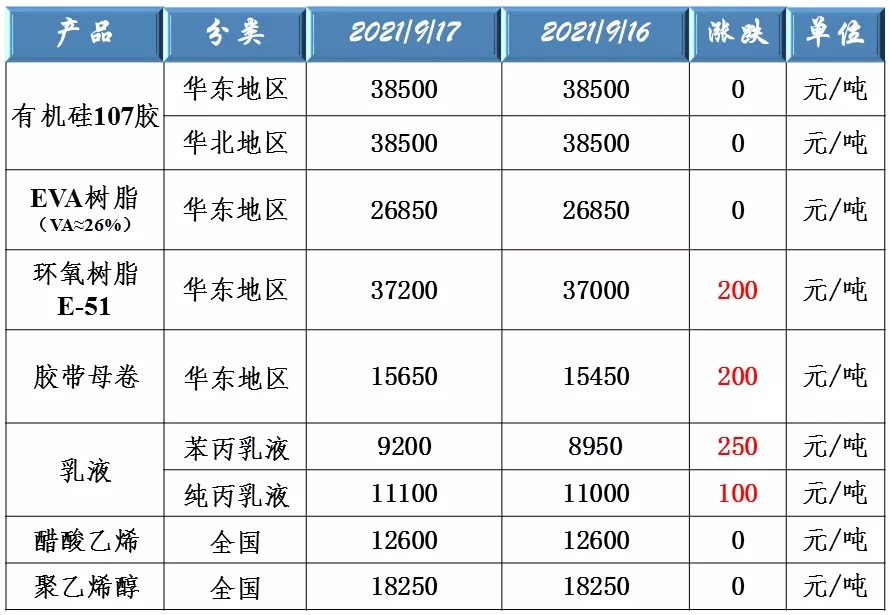 有機硅107、EVA樹脂、環(huán)氧樹脂、膠帶母卷、醋酸乙烯、聚乙烯醇和乳液原料價格走勢