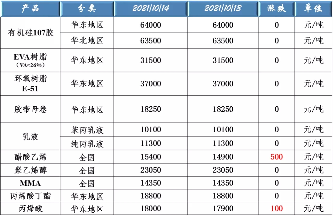 有機硅107、EVA樹脂、環(huán)氧樹脂、膠帶母卷、醋酸乙烯、聚乙烯醇、乳液及丙烯酸等原料價格走勢