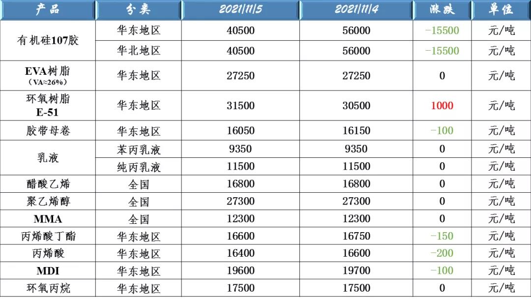 有機(jī)硅107、EVA樹脂、環(huán)氧樹脂、膠帶母卷、醋酸乙烯、聚乙烯醇、乳液、丙烯酸及MDI等原料價(jià)格走勢(shì)