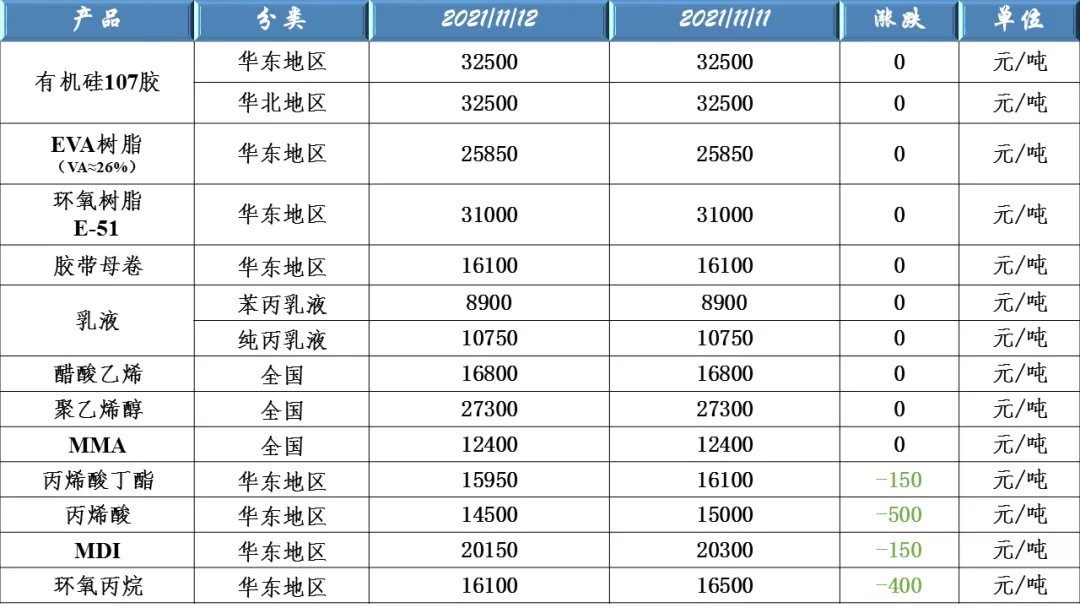 有機硅107、EVA樹脂、環氧樹脂、膠帶母卷、醋酸乙烯、聚乙烯醇、乳液、丙烯酸、MDI及環氧丙烷等原料價格走勢
