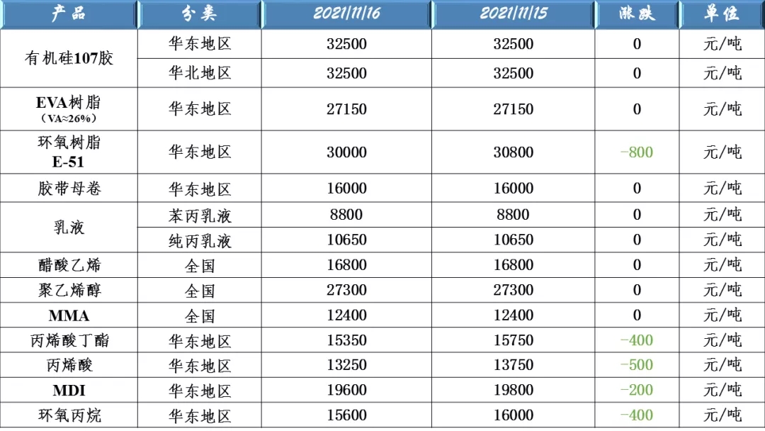 有機(jī)硅107、EVA樹(shù)脂、環(huán)氧樹(shù)脂、膠帶母卷、醋酸乙烯、聚乙烯醇、乳液、丙烯酸、MDI及環(huán)氧丙烷等原料價(jià)格走勢(shì)
