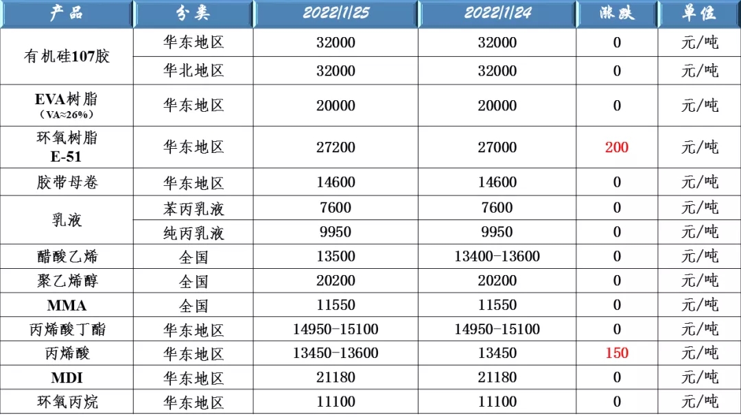 有機(jī)硅107、EVA樹脂、環(huán)氧樹脂、膠帶母卷、醋酸乙烯、聚乙烯醇和乳液原料價(jià)格走勢(shì)