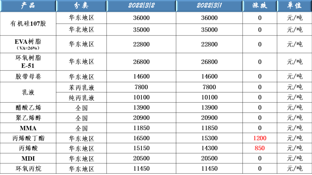 有機硅107、EVA樹脂、環(huán)氧樹脂、膠帶母卷、醋酸乙烯、聚乙烯醇、乳液、丙烯酸、MDI及環(huán)氧丙烷等價格走勢
