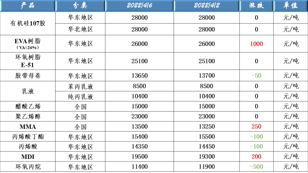 有機(jī)硅107、EVA樹(shù)脂、環(huán)氧樹(shù)脂、膠帶母卷、醋酸乙烯、聚乙烯醇、乳液、丙烯酸、MDI及環(huán)氧丙烷等原料價(jià)格走勢(shì)