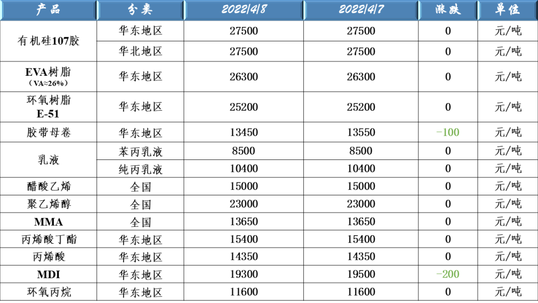 有機(jī)硅107、EVA樹脂、環(huán)氧樹脂、膠帶母卷、醋酸乙烯、聚乙烯醇、乳液、丙烯酸、MDI及環(huán)氧丙烷等原料價格走勢
