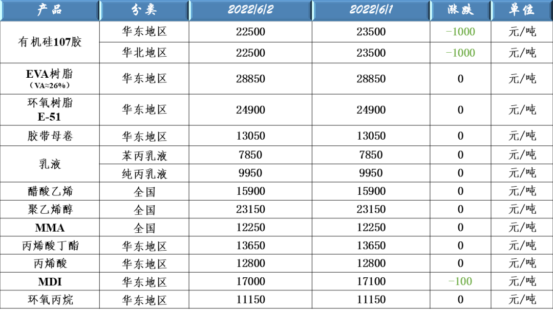 有機(jī)硅107、EVA樹脂、環(huán)氧樹脂、膠帶母卷、醋酸乙烯、聚乙烯醇、乳液、丙烯酸、MDI及環(huán)氧丙烷等原料價(jià)格走勢(shì)
