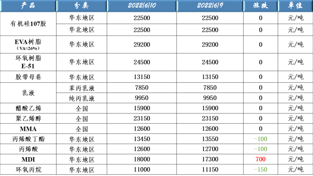 有機(jī)硅107、EVA樹脂、環(huán)氧樹脂、膠帶母卷、醋酸乙烯、聚乙烯醇、乳液、丙烯酸、MDI及環(huán)氧丙烷等原料價格走勢