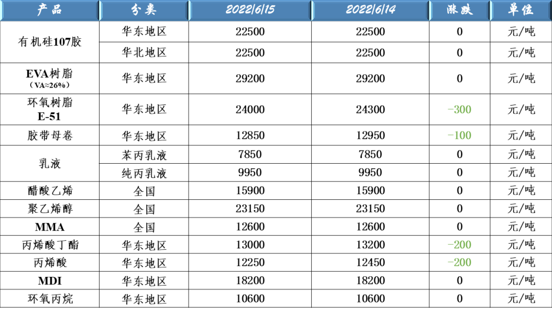 有機硅107、EVA樹脂、環氧樹脂、膠帶母卷、醋酸乙烯、聚乙烯醇、乳液、丙烯酸、MDI及環氧丙烷等價格走勢