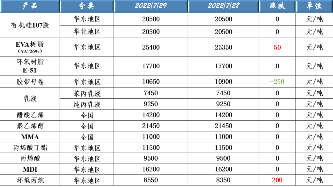 有機(jī)硅107、EVA樹脂、環(huán)氧樹脂、膠帶母卷、醋酸乙烯、聚乙烯醇、乳液、丙烯酸、MDI及環(huán)氧丙烷等原料價(jià)格走勢