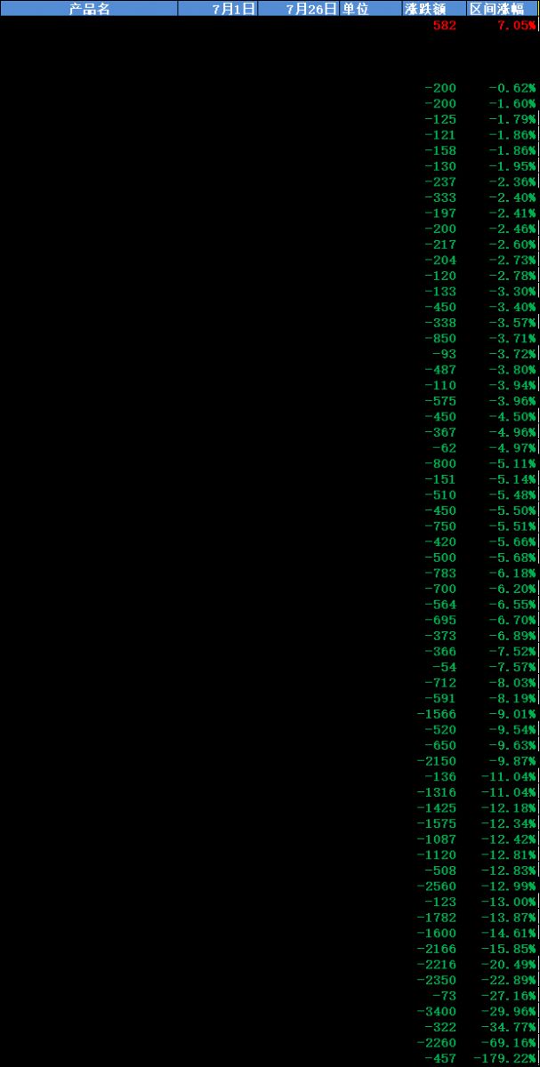隨著全球加息浪潮開啟,人們對經濟衰退擔憂加劇,自7月1日以來,大宗一直延續跌勢,跌多漲少的局面已經持續一個月,7月大宗漲跌榜中,跌價產品多達63種,其中跌幅最大的產品為液氯,跌幅達-179%。