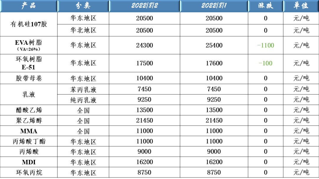 有機(jī)硅107、EVA樹脂、環(huán)氧樹脂、膠帶母卷、醋酸乙烯、聚乙烯醇、乳液、丙烯酸、MDI及環(huán)氧丙烷等原料價格走勢