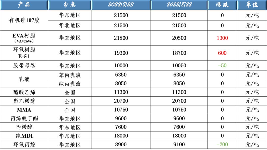 有機(jī)硅107、EVA樹脂、環(huán)氧樹脂、膠帶母卷、醋酸乙烯、聚乙烯醇、乳液、丙烯酸、MDI及環(huán)氧丙烷等原料價格走勢