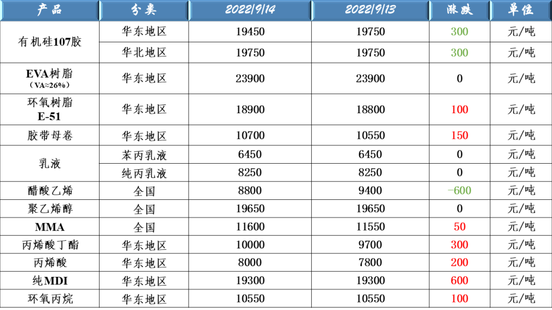 有機硅107、EVA樹脂、環(huán)氧樹脂、膠帶母卷、醋酸乙烯、聚乙烯醇、乳液、丙烯酸、MDI及環(huán)氧丙烷等原料價格走勢