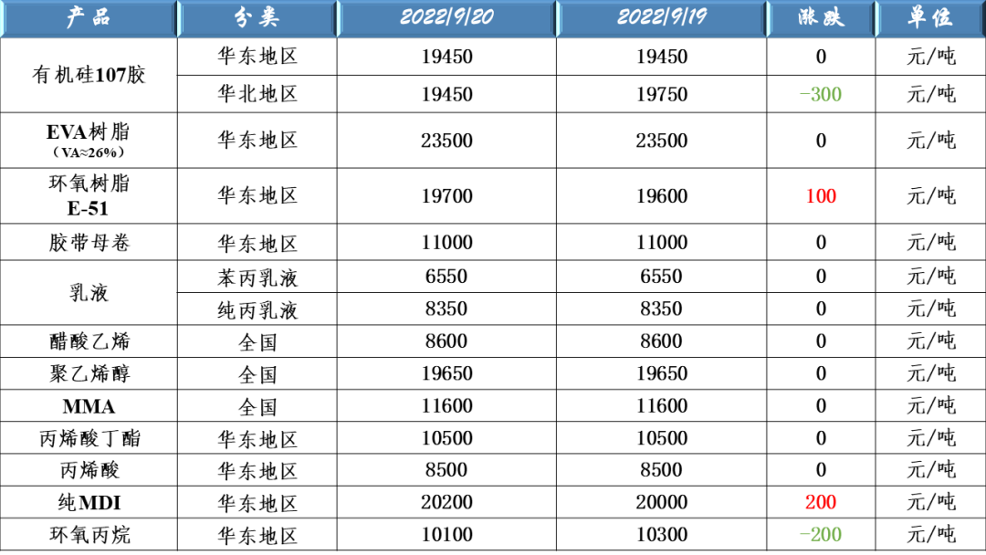 有機硅107、EVA樹脂、環氧樹脂、膠帶母卷、醋酸乙烯、聚乙烯醇、乳液、丙烯酸、MDI及環氧丙烷等原料價格走勢