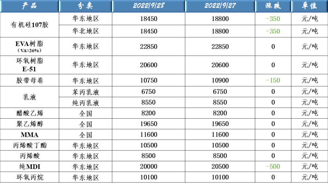 有機(jī)硅107、EVA樹脂、環(huán)氧樹脂、膠帶母卷、醋酸乙烯、聚乙烯醇、乳液、丙烯酸、MDI及環(huán)氧丙烷等原料價(jià)格走勢