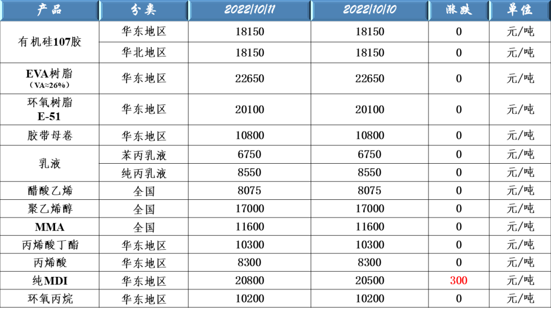 有機(jī)硅107、EVA樹脂、環(huán)氧樹脂、膠帶母卷、醋酸乙烯、聚乙烯醇、乳液、丙烯酸、MDI及環(huán)氧丙烷原料價(jià)格走勢