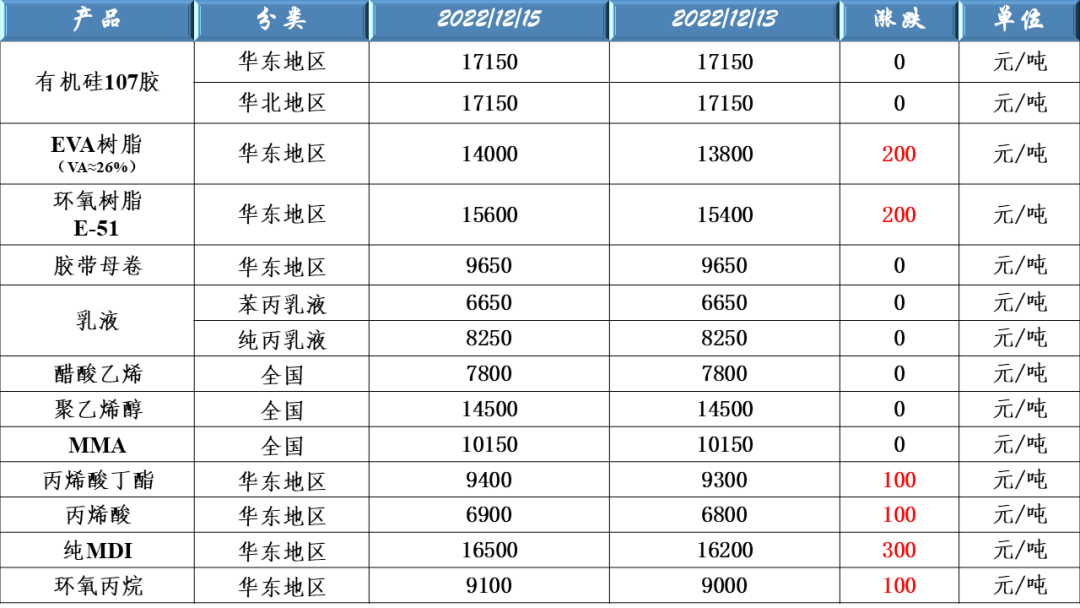有機(jī)硅107、EVA樹脂、環(huán)氧樹脂、膠帶母卷、醋酸乙烯、聚乙烯醇、乳液、丙烯酸、MDI及環(huán)氧丙烷原料價(jià)格走勢