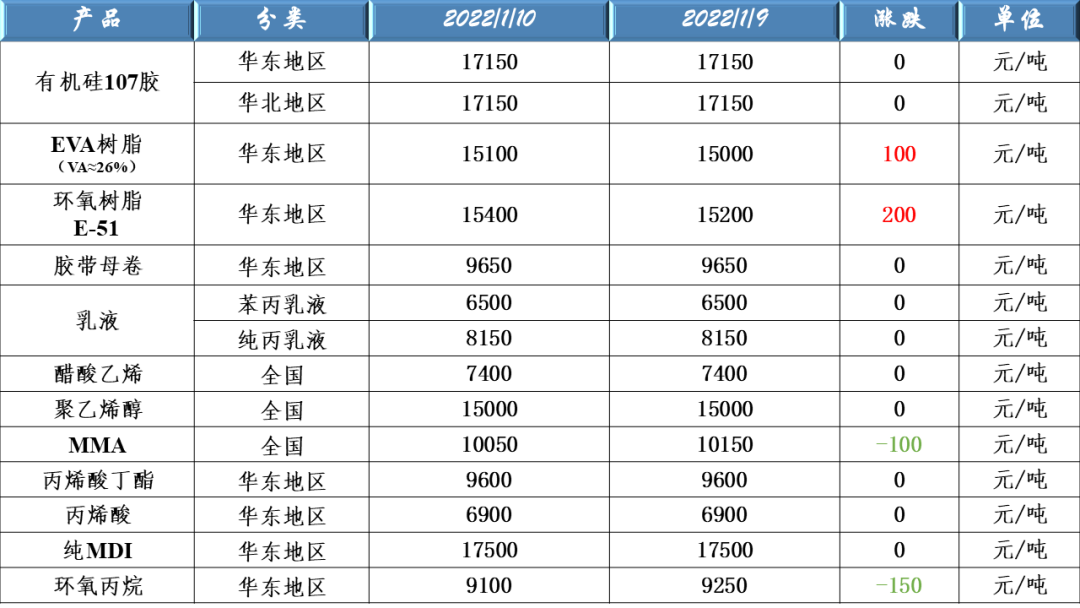 有機(jī)硅107、EVA樹脂、環(huán)氧樹脂、膠帶母卷、醋酸乙烯、聚乙烯醇、乳液、丙烯酸、MDI及環(huán)氧丙烷原料價格走勢