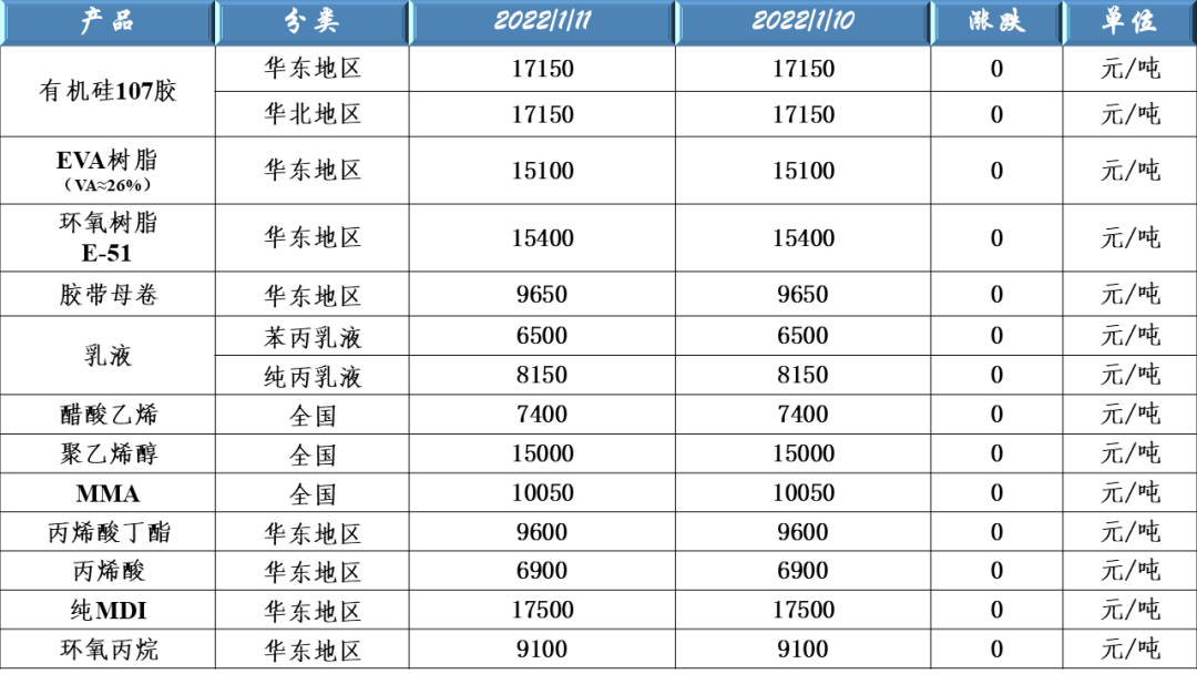 有機硅107、EVA樹脂、環(huán)氧樹脂、膠帶母卷、醋酸乙烯、聚乙烯醇、乳液、丙烯酸、MDI及環(huán)氧丙烷原料價格走勢