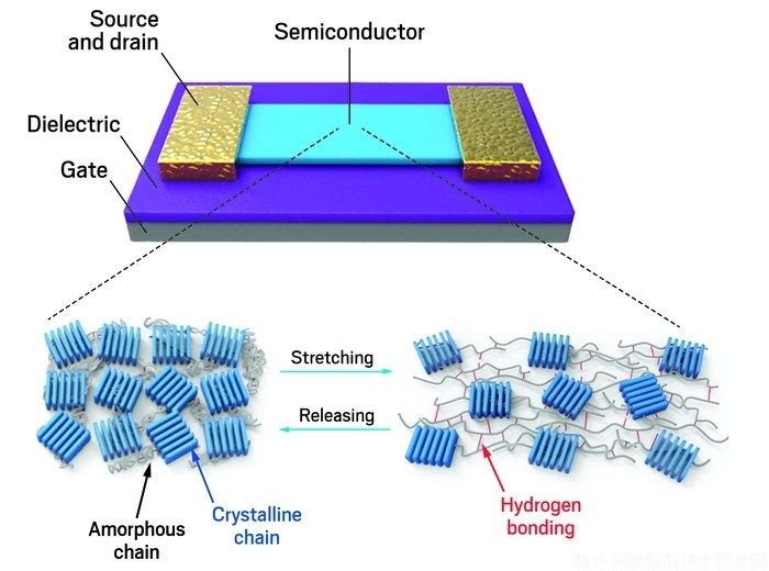 這種彈性晶體管由兩部分組成:一是剛性的半導(dǎo)體,二是連接這些半導(dǎo)體的無定形鏈。拉伸時,無定形鏈間由氫鍵連接,收縮時氫鍵斷裂吸收機(jī)械應(yīng)力。來源:Nature/cen.acs.org