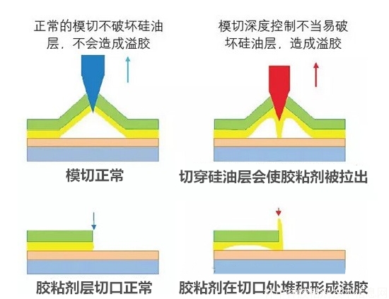 模切時(shí)如未將膠黏劑層切斷,會(huì)和切斷的膠黏劑層回流一樣,發(fā)生粘連,排廢時(shí)廢邊下和標(biāo)簽下的膠黏劑因此被逐漸拉長(zhǎng)成絲后才斷裂。這些飄浮的斷絲不斷地掉落在向前的標(biāo)簽邊沿,形成單邊(模切走紙方向的標(biāo)簽一邊)溢膠的現(xiàn)象。