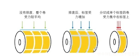 分切成客戶使用的小卷時(shí),張力過(guò)大會(huì)使小卷收得很緊,小卷經(jīng)過(guò)模切排廢后,由于底紙表面已形成單個(gè)標(biāo)簽,張力作用產(chǎn)生的擠壓力則由原來(lái)散布在整個(gè)紙卷表面(包括廢邊)轉(zhuǎn)換到集中在單個(gè)標(biāo)簽上(已去除廢邊)。所以排廢后,標(biāo)簽是直接承受擠壓力的部位。